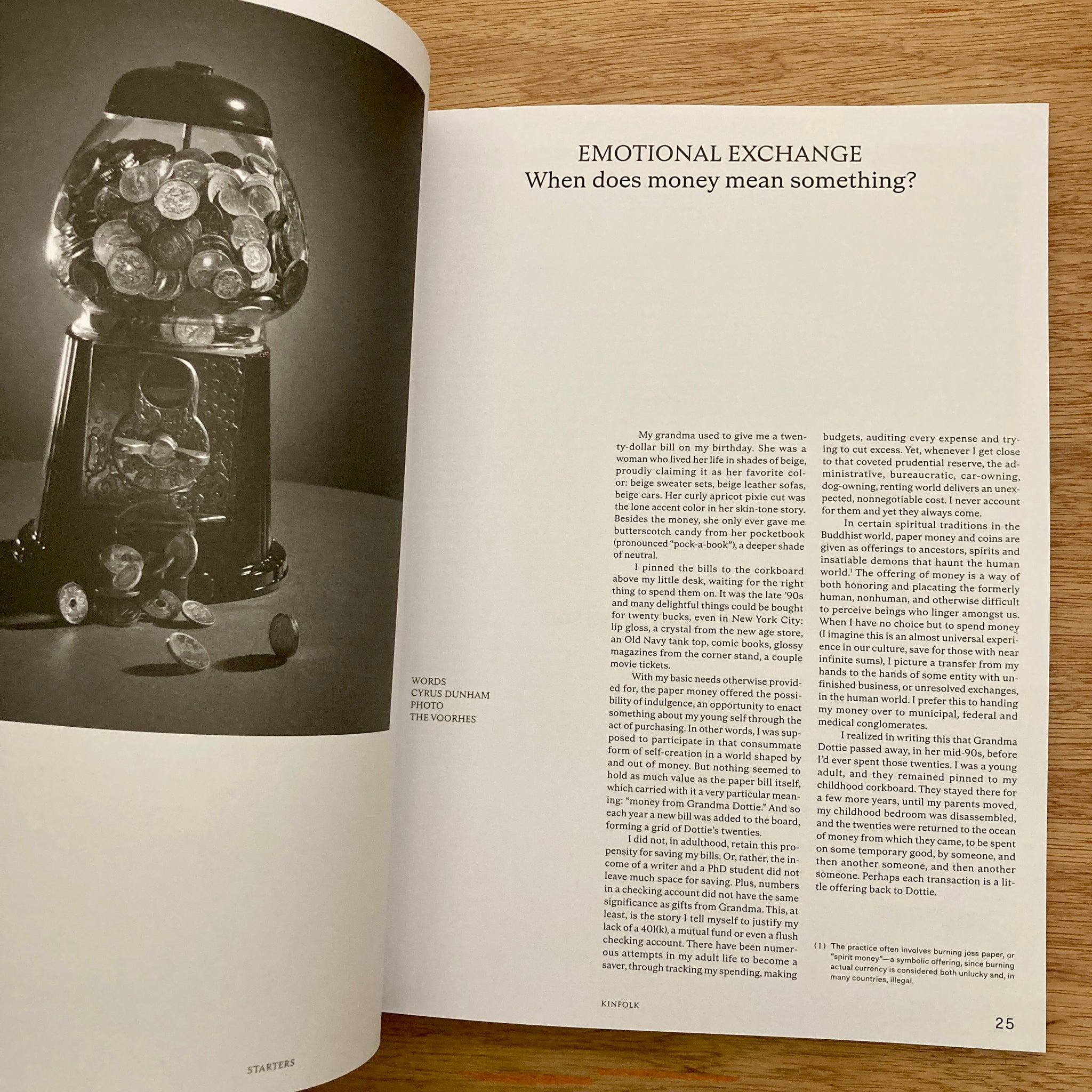 "In Issue Fifty-Eight, Kinfolk examines our relationship with money—not as currency or an endgame, but as an emotional force that shapes how we live and who we become. Writer Otegha Uwagba reflects on financial independence and the widening divide between those who inherit wealth and those who don’t, and Hettie O’Brien meets the recipients of extreme intergenerational wealth and finds that privilege doesn’t always bring peace of mind. Meanwhile Elie Hassenfeld of GiveWell explains how his empirical approach to philanthropy measures the real impact of giving, and HTSI editor Jo Ellison offers her perspective on “how to spend it.”