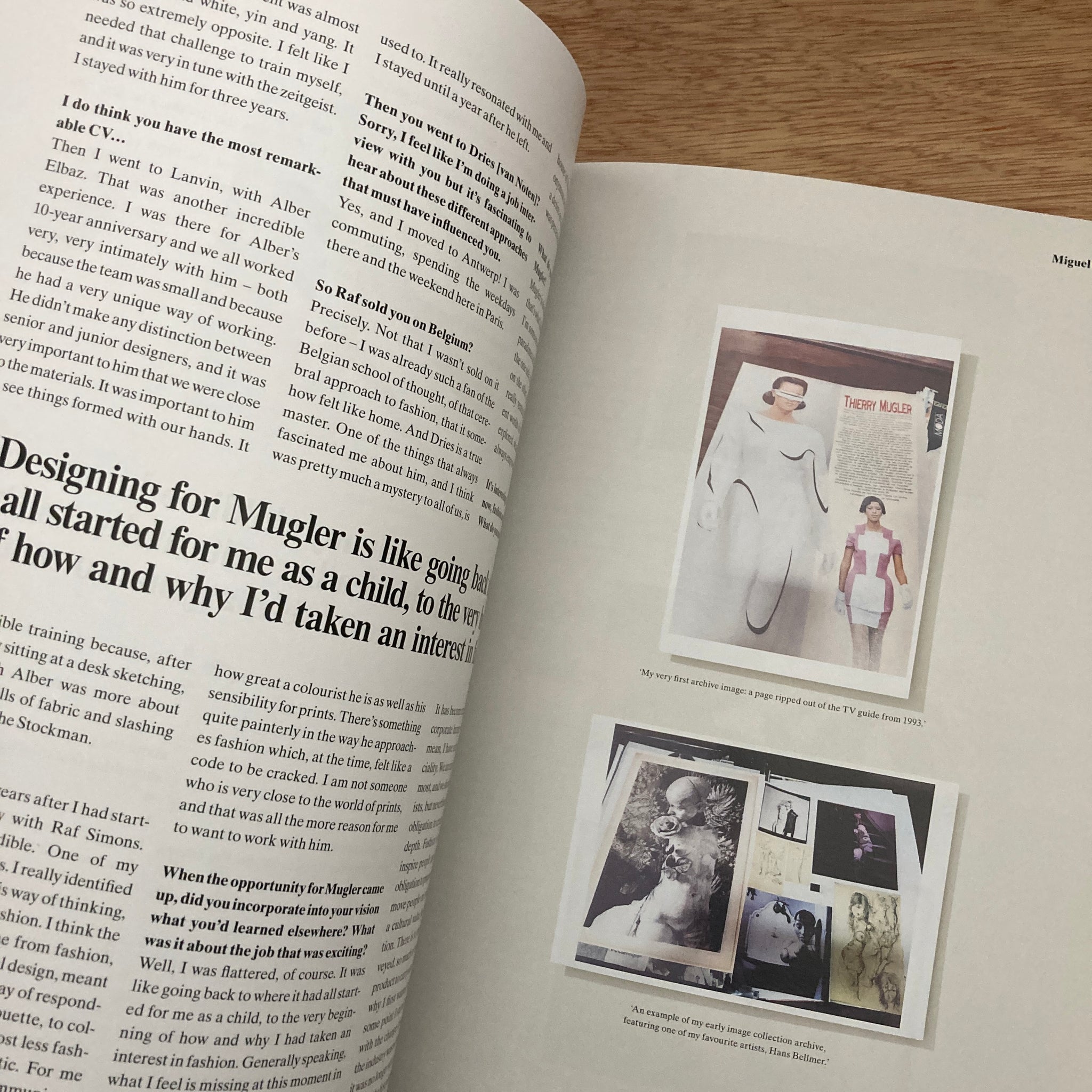 Miguel Castro Freitas, Mugler’s new creative director, recalls sketching his first collection at the tender age of six, and discovering Thierry Mugler’s futurist work as a teenager in Portugal through his local TV guide – a glimpse that foreshadowed his path to the house. In our interview and accompanying scrapbook of personal archive imagery, he reflects on how those early influences shape his balancing of Mugler’s theatrical heritage with a modern sensibility attuned to our times.