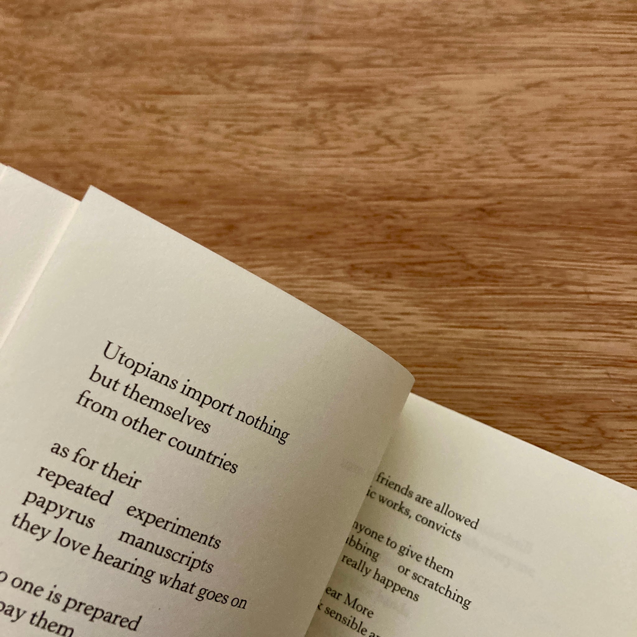 Consisting of a sequence written entirely with language from Thomas More’s Utopia, a series of letters to More, and a poem called “THE WORLD” about Utopia’s vexed escape, Grace Nissan’s The Utopians cuts up and breaks into the language circumscribing the perfect world. With this stirring formal exploration of liberation, Nissan deftly occupies an in-between space, aiming a rigorous poetic eye at the present to interrogate ghosts of the future.